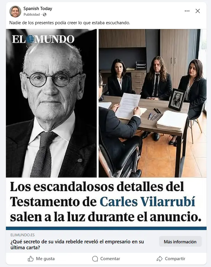 El mecanismo de esta estafa de plataformas de inversión con famosos es tan sencillo como eficaz. Los estafadores contratan publicidad en Meta —principalmente en Facebook— y la segmentan con precisión quirúrgica. El anuncio te lleva a una web que imita casi a la perfección la de un medio digital real. Tipografía, estructura, fotografías, comentarios simulados… todo está pensado para que no dudes.